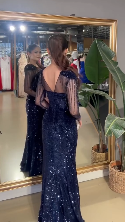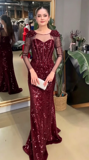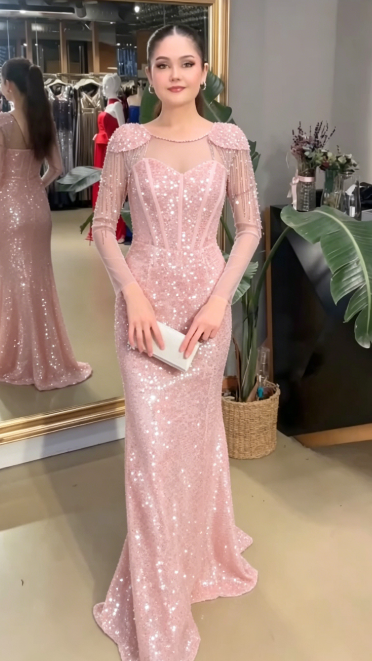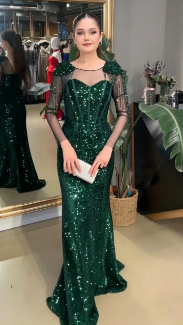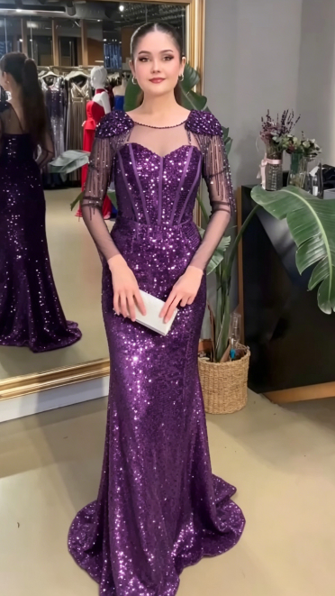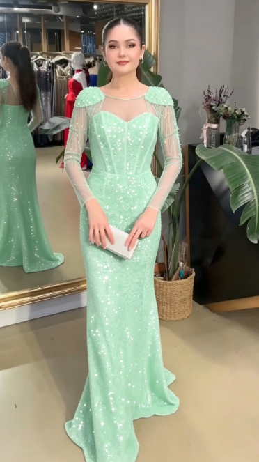 Elegancka sukienka wieczorowa w formie ogona, uszyta z błyszczącego materiału.