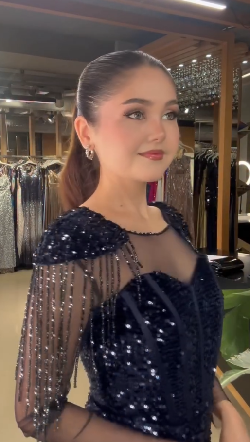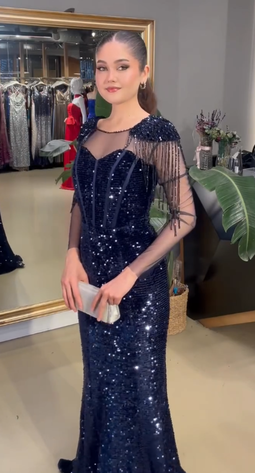 Błyszczące zdobienia, koronkowe rękawy i klasyczny krój podkreślają figurę i dodają blasku.