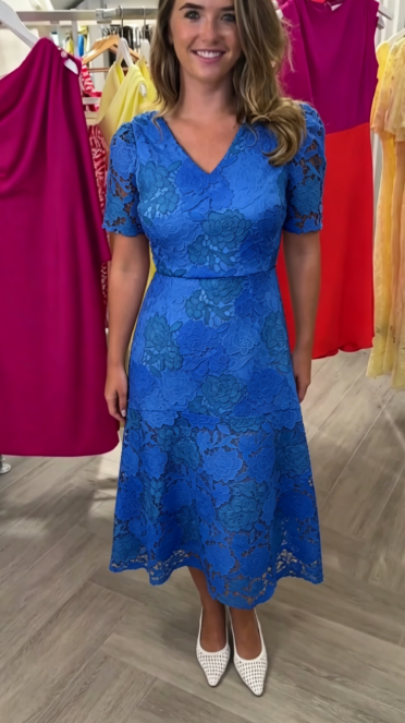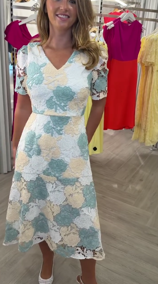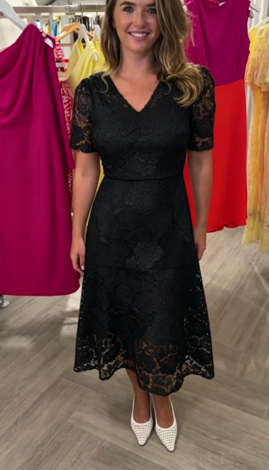 - Dopasowana talia podkreśla atuty sylwetki, a rozkloszowana spódnica midi tworzy piękny,