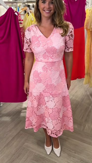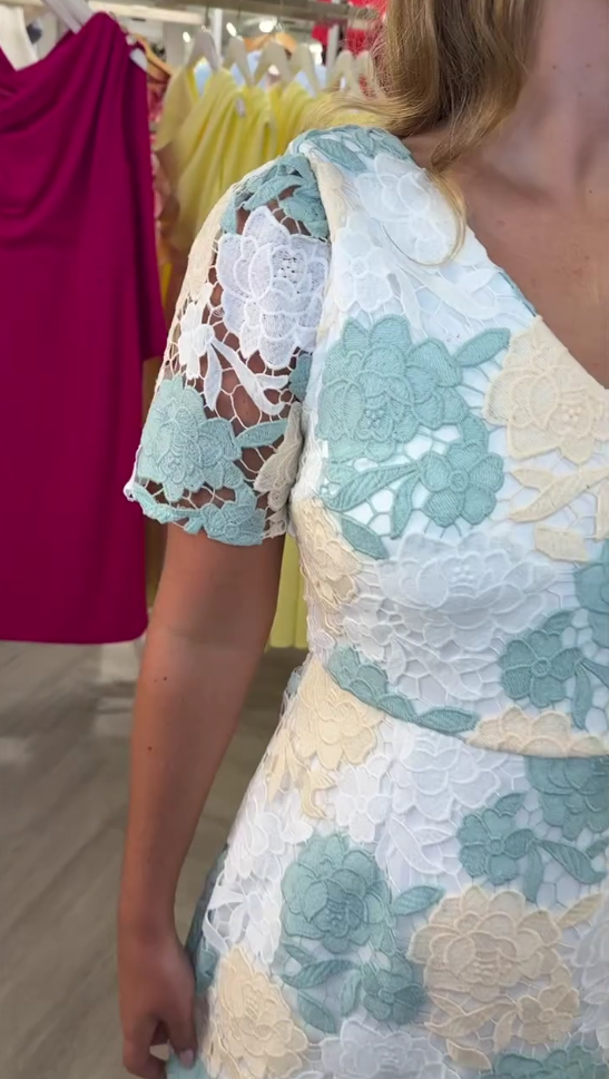 - Sukienka wykonana jest z wysokiej jakości, miękkiej koronki z delikatnym, kwiatowym wzorem,