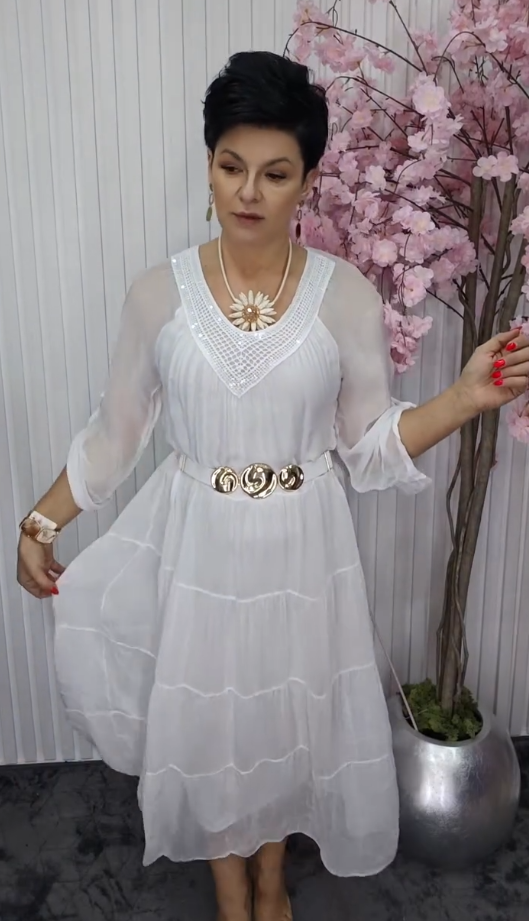 który idealnie pasuje do każdej sylwetki, a delikatny nadruk dodaje jej uroku.