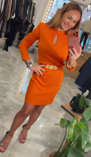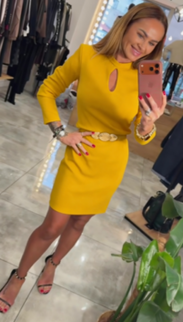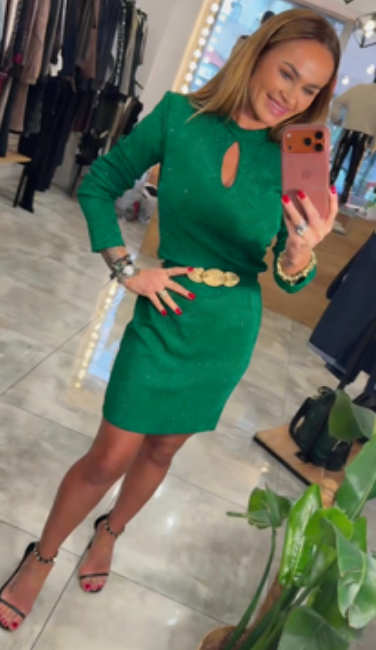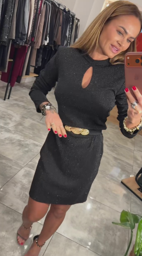 Czarna, dopasowana sukienka mini z wycięciami i subtelnie połyskującymi zdobieniami, długie rękawy.
