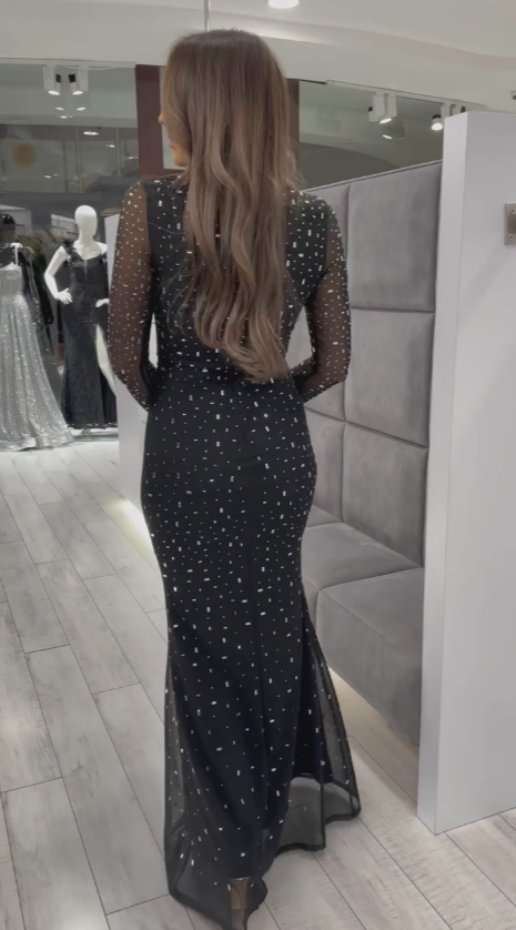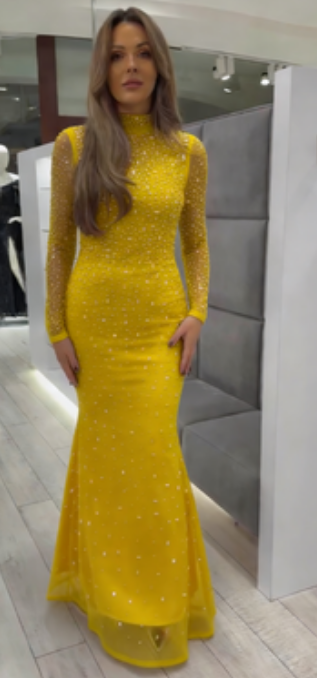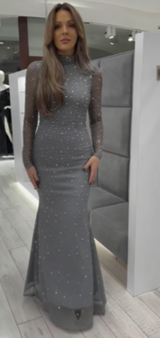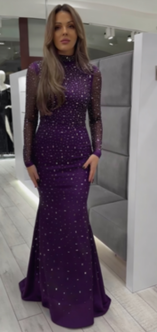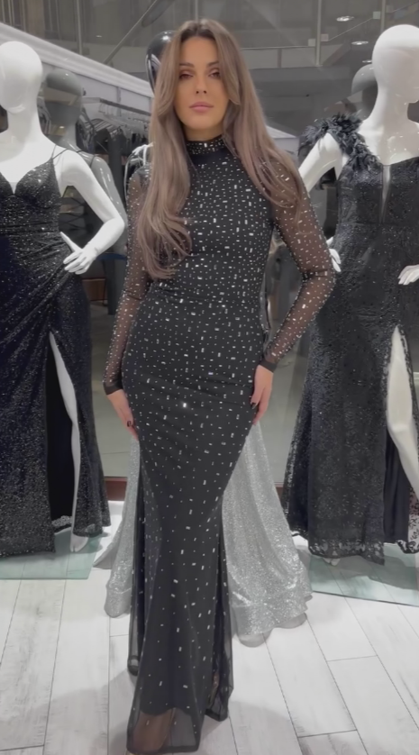 Suknia typu rybi ogon z wysokim kołnierzem, długimi rękawami i siateczkowymi rękawami