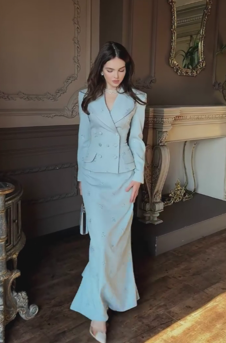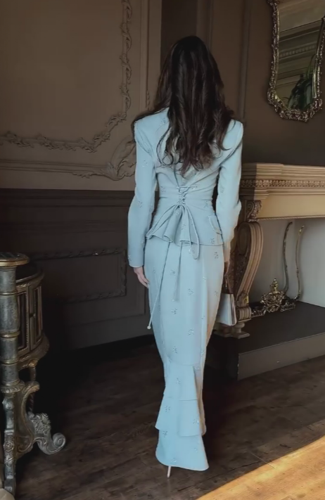 - Miękka, dopasowana tkanina + błyskotki + wiązanie na plecach: Delikatny niebieski kolor dodaje stylizacji świeży, elegancki charakter, a błyskotki i wiązanie podkreślają sylwetkę – idealny do gali, wesel lub specjalnych okazji.