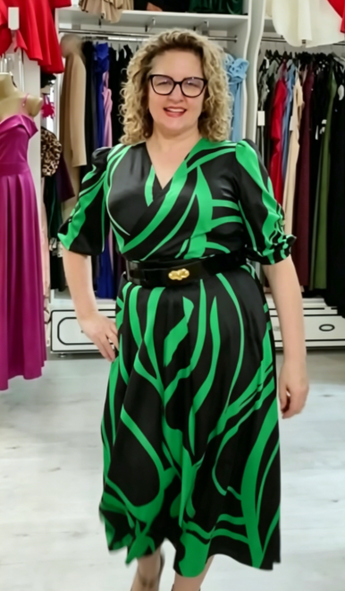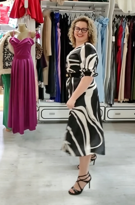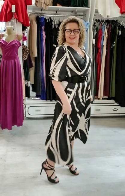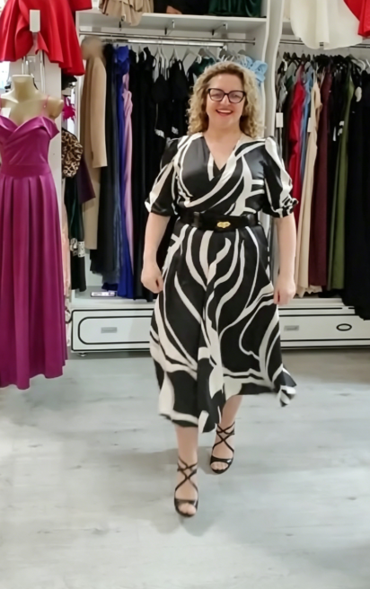 Satynowa sukienka z printem i paskiem – idealna na co dzień i do pracy!