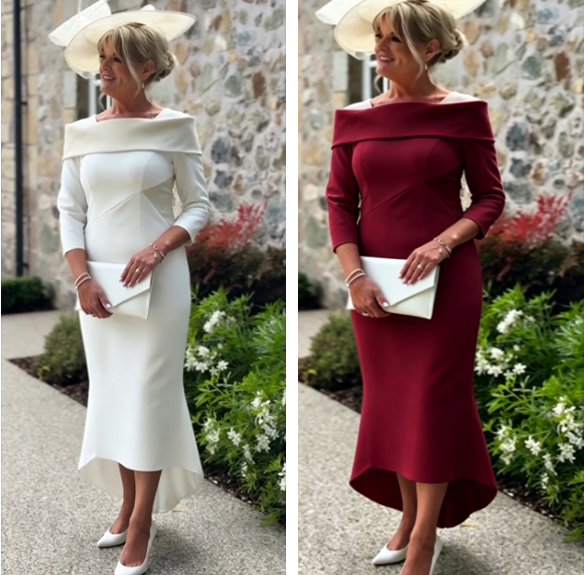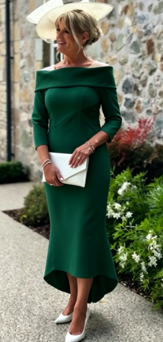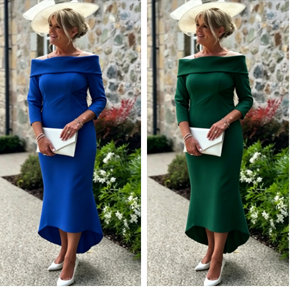 Elegancka sukienka wieczorowa z odsłoniętymi ramionami i asymetryczną spódnicą.
