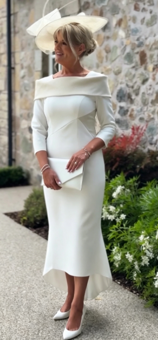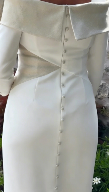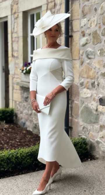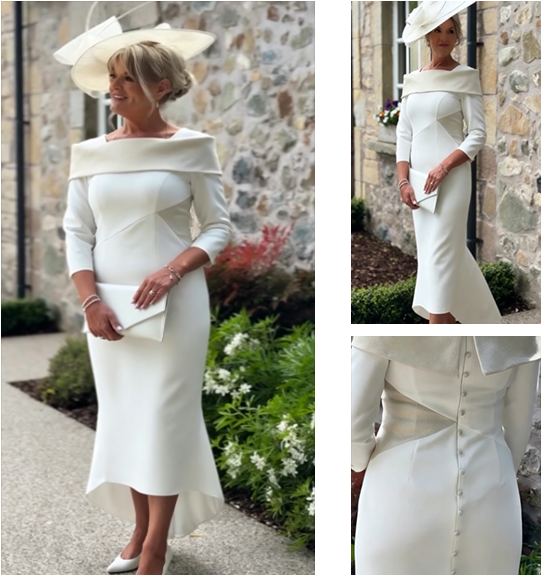 asymetryczna spódnica i dekolt podkreślają figurę, emanując klasą i wyrafinowaniem.