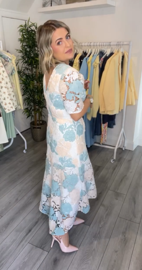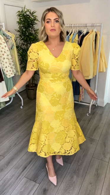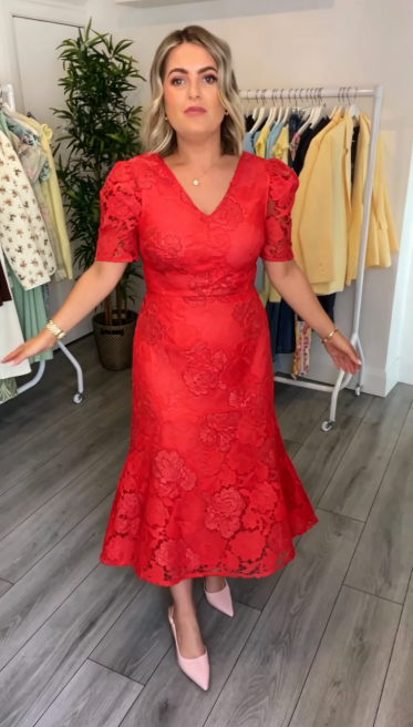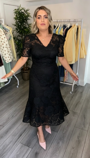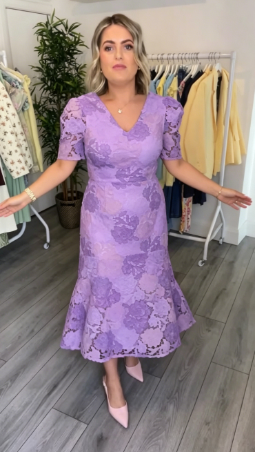 Dopasowana talia i rozkloszowany dół ukrywają niedoskonałości sylwetki, a koronkowa tekstura dodaje wyjątkowego charakteru.