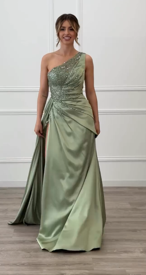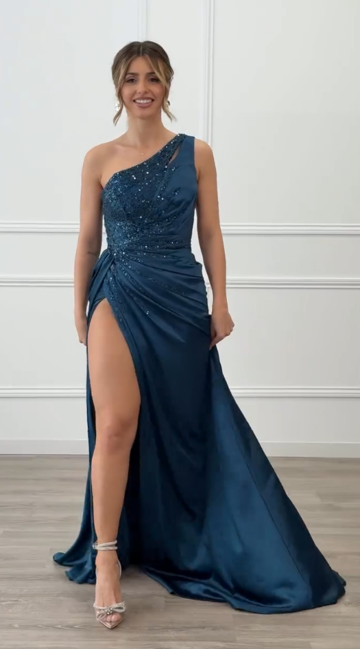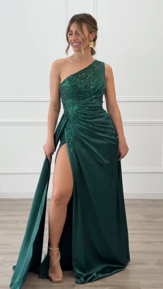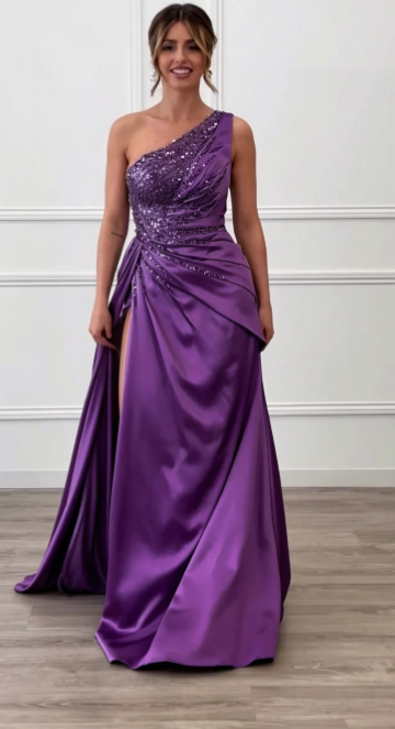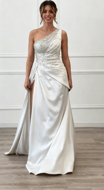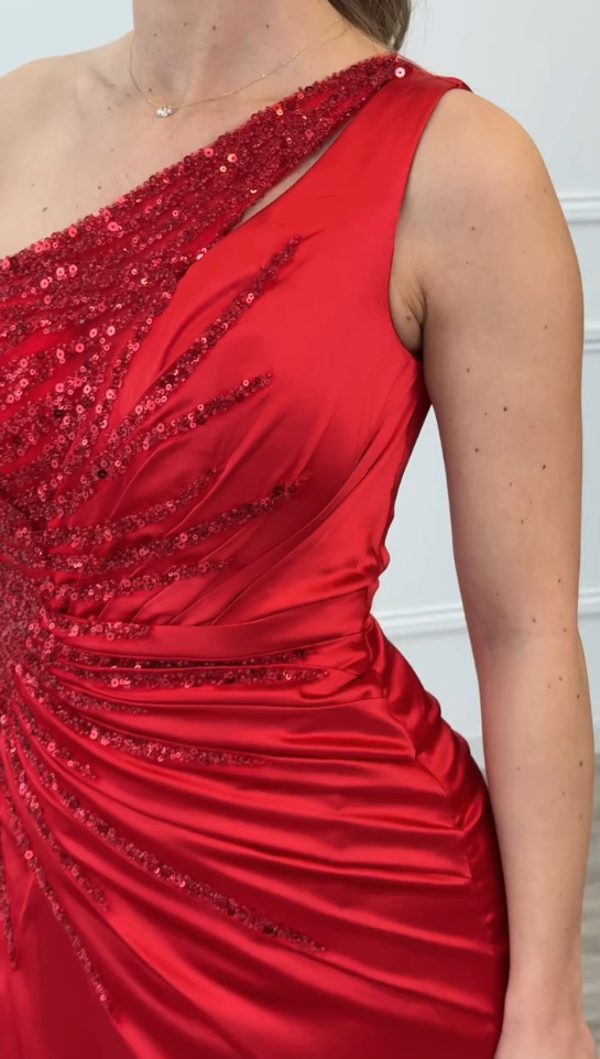 Asymetryczny fason z jednym ramiączkiem, górna część w całości pokryta haftem z cekinów,