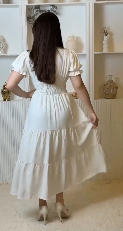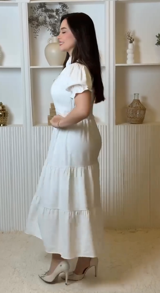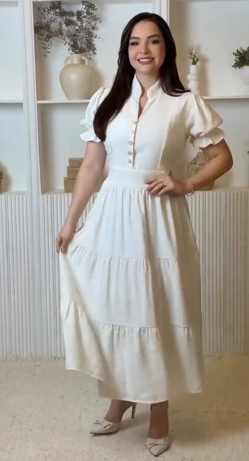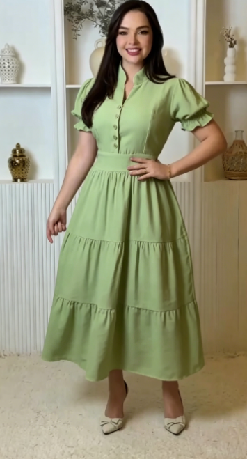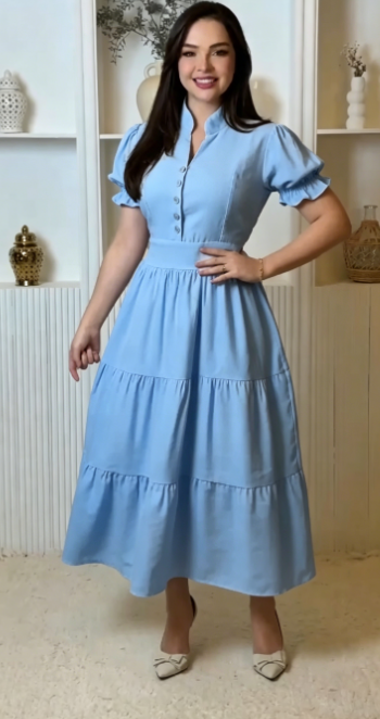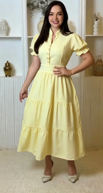 Suknia koszulowa z stojącym kołnierzykiem, rękawami balonowymi i warstwową spódnicą.