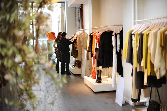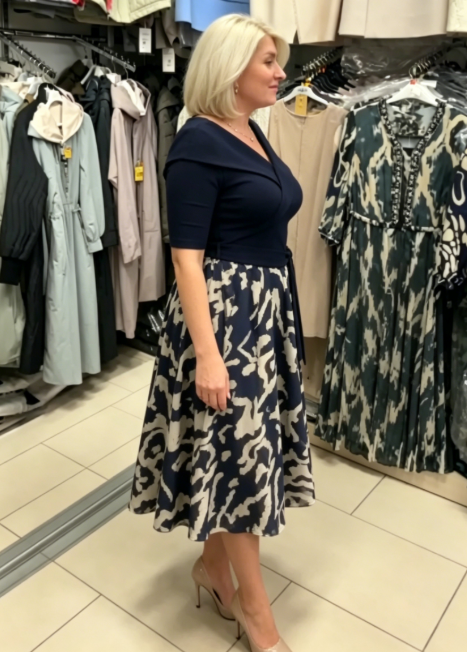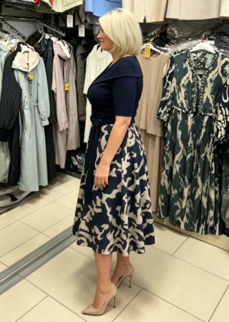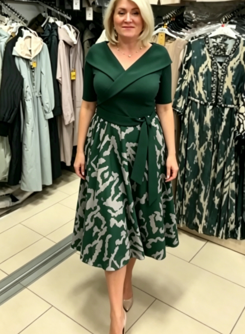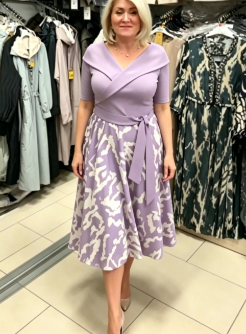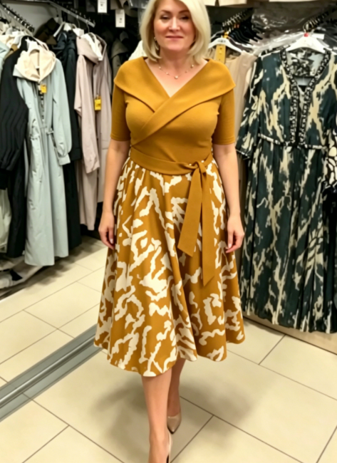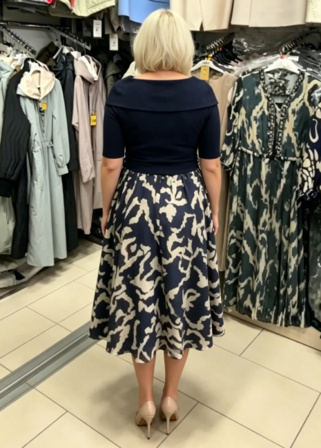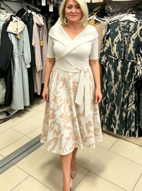 Suknia z górą w jednym kolorze i spódnicą z abstrakcyjnym wzorem